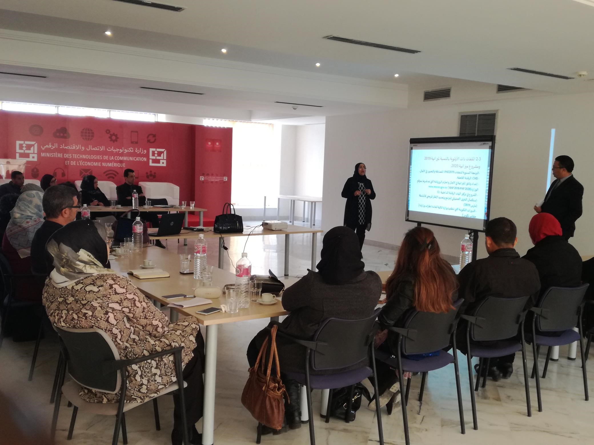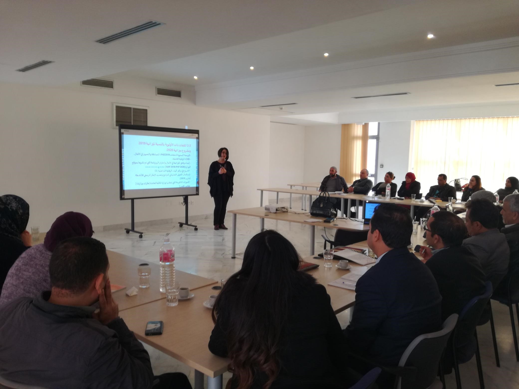 L’unité GBO a organisé le 28 février 2019 ,une session de formation portant sur le thème :" le Cadre de performance du MTCEN pour l’année 2019 et la déclinaison opérationnelle des programmes du ministère" au profit des cadres du ministère et représentants des opérateurs publics concernés. Cette session a été animée par Mme Neila OUESLATI CHERIF chef d’unité GBO en collaboration avec les cadres de l’unité.
